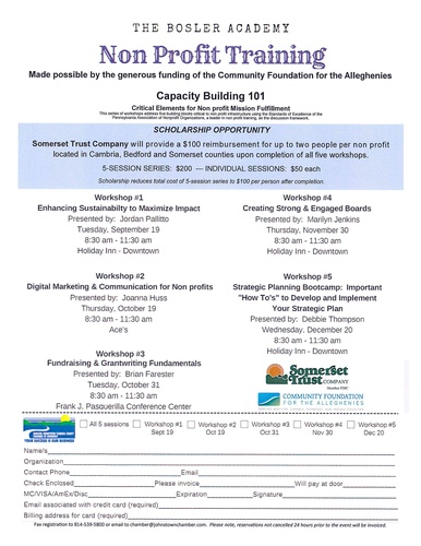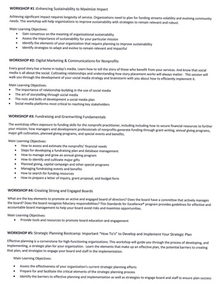 All workshop will be held from 8:30 am to 11:30 am. Locations very. Capacity Building 101 5 Session Series $200
